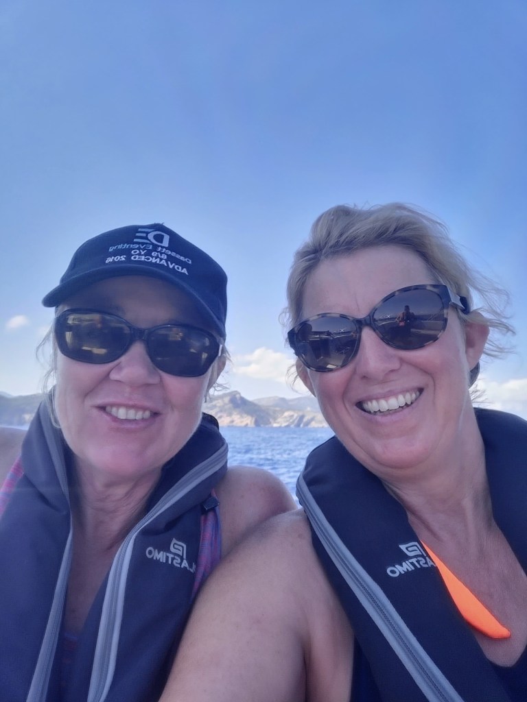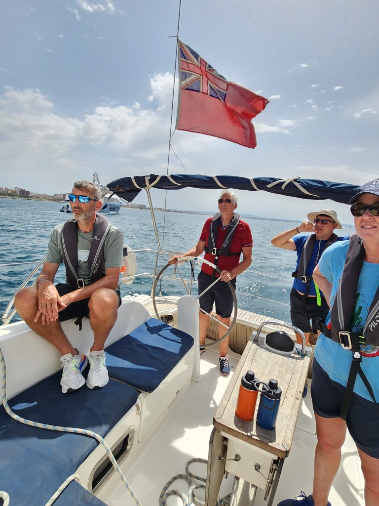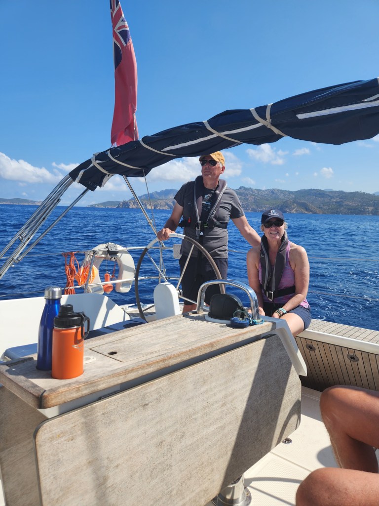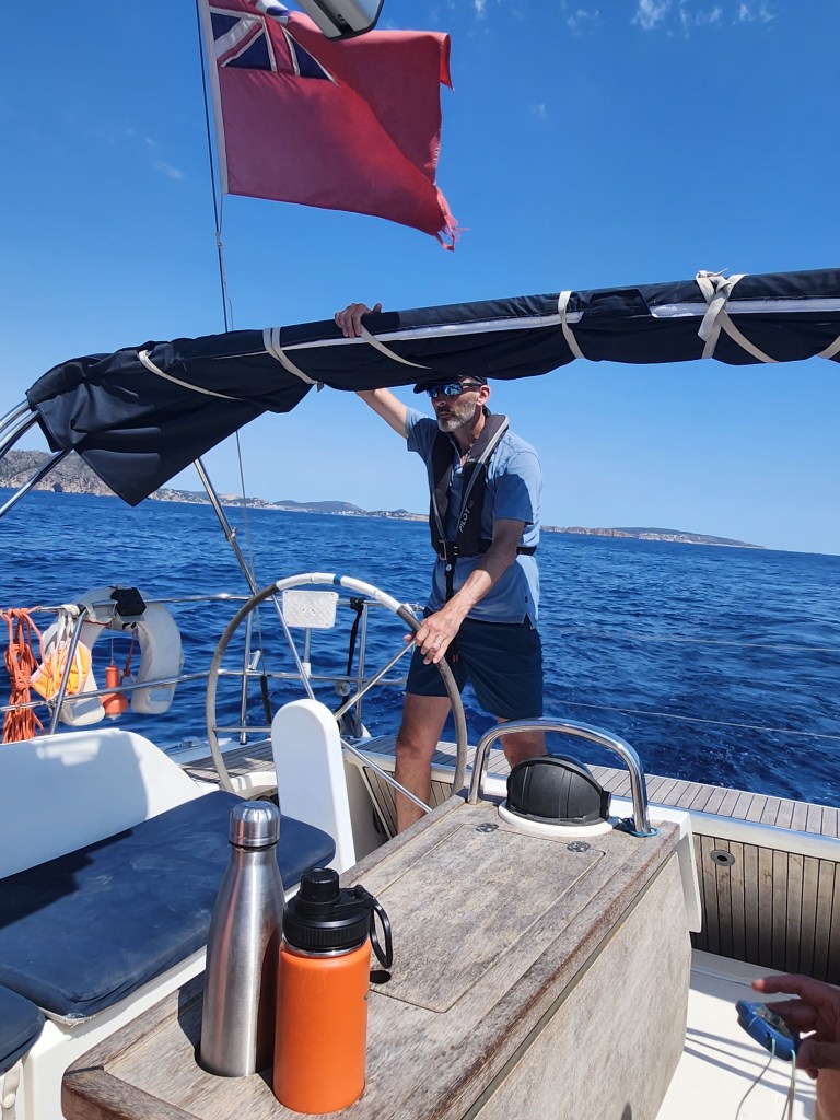 So we thought the first day was full-on but it was a doddle compared to the second. It had a different feel from the start. We were told to divide the day into three parts and select a skipper for each. Fran was volunteered 😊to take the first part. She had to give the safety briefing remembering everything she’d been told the previous day and take us away from our berth. But not before having to quickly draft a detailed passage plan involving charts bearings. We had done one the night before and it had taken us over an hour but it wasn’t good enough. Fran had to revise it………quickly. Its safe to say she found that quite challenging. We sailed to the port of Andratx but not before a rather stressful lunchtime anchor at Camp de Mar. The approach was crowded and getting into position was difficult with slightly vague and ever-changing advice from our instructor. The fun really started when we departed, as only we could create a situation that the instructor said he’s never seen before. The anchor and its chain bounced out of the bow roller, which meant having to lift the anchor by hand……..and it was heavy. Stuart then took the helm to sail us to Andratx, which was his first entry into port but it went smoothly, unlike the yacht that came alongside us later with a professional skipper. Let’s just say that after taking a chunk out of us he’ll be losing his no claims.